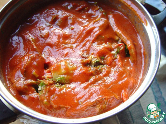 Залить все томатным соком или разведенной в воде томатной пастой. Конечно, лучше и тут использовать свежие помидоры, но в это время года они уже только тепличные, поэтому я предпочитаю так. Аккуратно кончиком ножа раздвинуть овощи, чтобы жидкость распределилась равномерно, накрыть крышкой и тушить на медленном огне 10-15 минут.