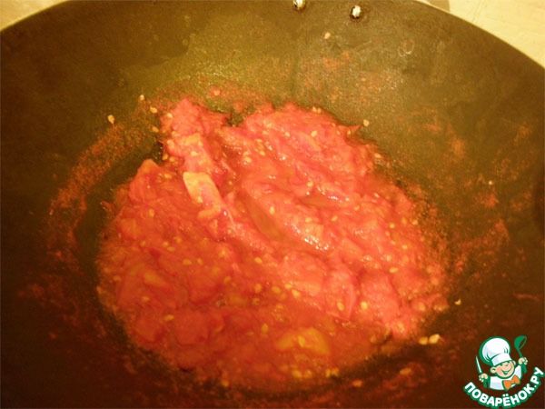 Помидоры потереть на терке и тушить на медленном огне 15 минут с добавлением 1/2 чайной ложки сахара, 1/2 чайной ложки соли и 1 столовой ложки уксуса.