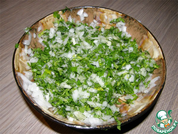 Лук и зелень мелко порезать, выдавить чеснок, перемешать.