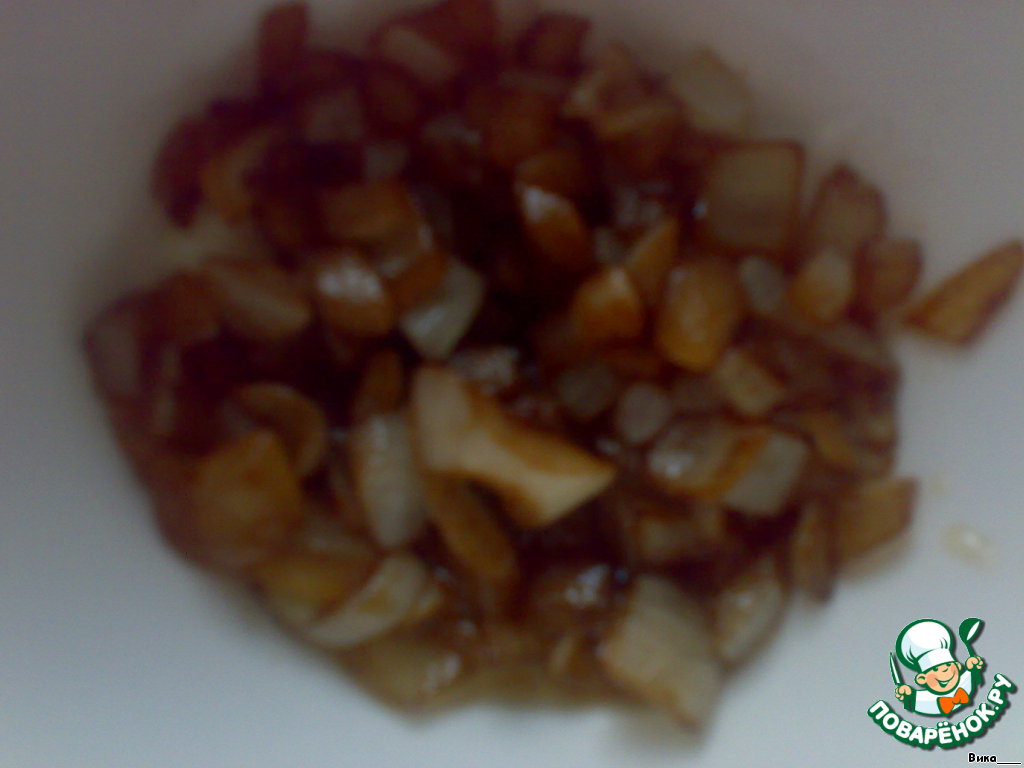 Нарезаем помидор ломтиками, а мелко нарезанный лук обжариваем до карамельного цвета.