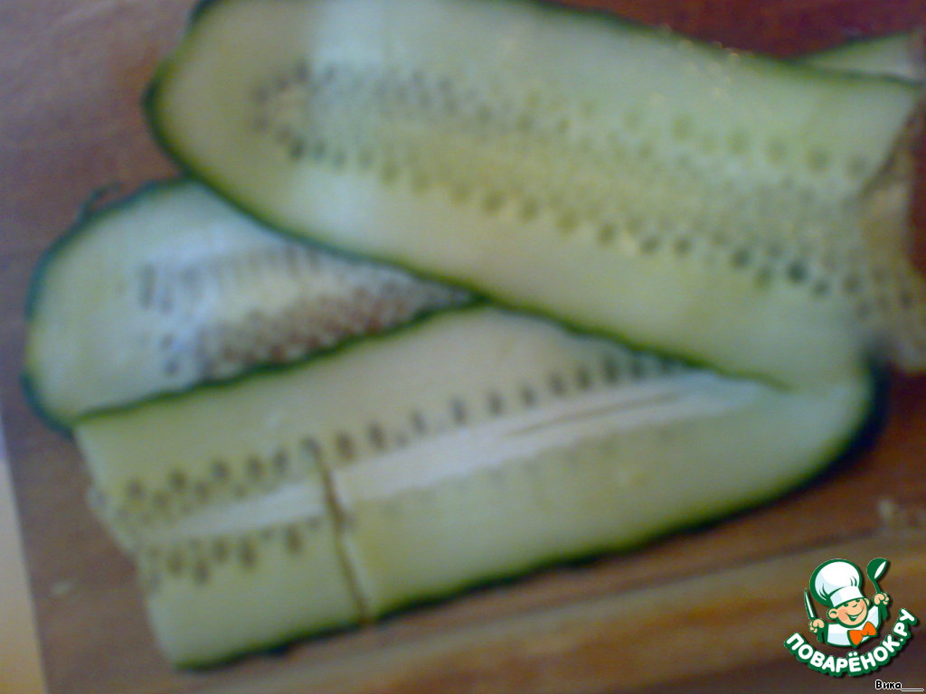 Огурец очень тонко разрезаем вдоль (лучше воспользоваться специальной тёркой)