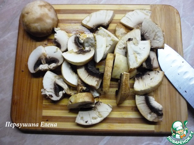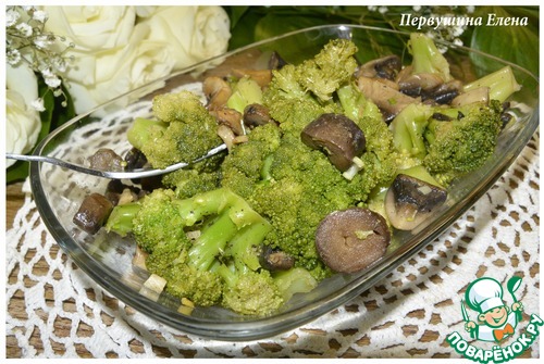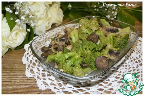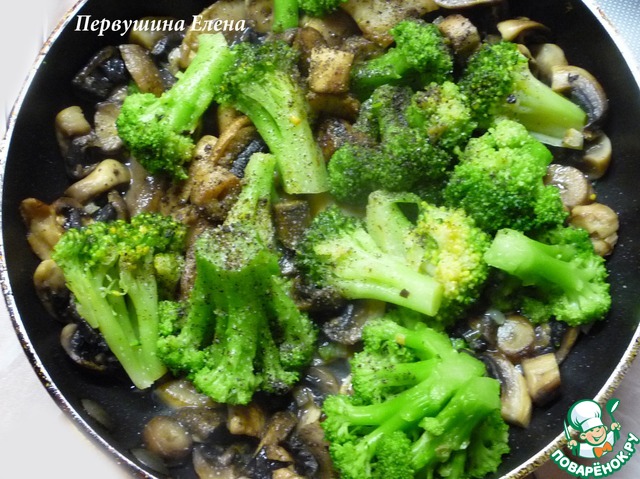 Брокколи разделить на соцветия и добавить к грибам. Посолить, поперчить.
