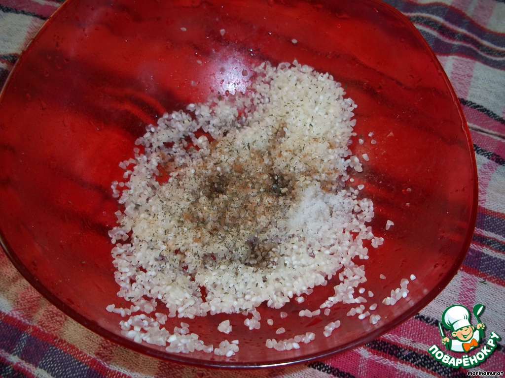 Делаем начинку: рис промыть в холодной водичке, добавить к нему 4-5 ст.л. оливкового масла, виноградный соус (если нету, ну и ладно:)), имбирь, корицу, мяту, перец черный молотый и соль. Часто добавляют очень мелкий изюм и кедровые орешки, но у меня их в этот раз не оказалось и они не являются обязательными, но придают блюду особый вкус! Все перемешиваем.
