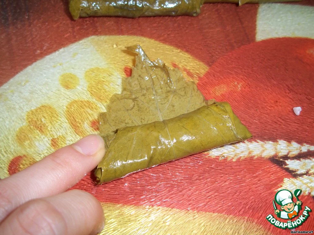 На лист кладем 1 ч.л. начинки, распределяем ее равномерно у края листика и заворачиваем туго, подгибая торчащие концы листьев внутрь.
