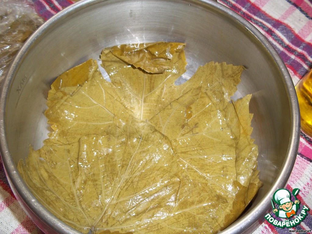Я покупаю готовые листья на рынке и они очень соленые, поэтому я всегда вымачиваю их в воде сутки, меняя несколько раз водичку. Для сармы выбирайте маленькие по размеру листья, а крупные используйте для долмы. От листьев нужно оторвать палочки, и начинку будем класть на темную сторону.