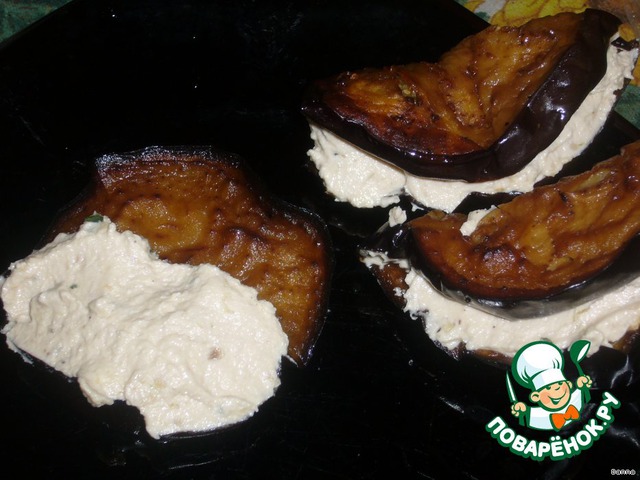 Взять отстоявшиеся обжаренные кружочки баклажан и на каждый выкладывать перемолотую массу. Складывать вдвое и выкладывать на блюдо.