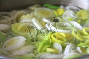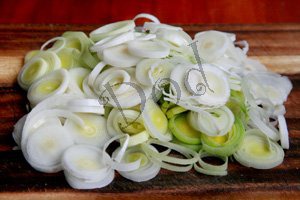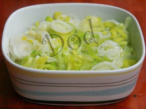 Лук-порей вымыть, нарезать тонкими кольцами.
