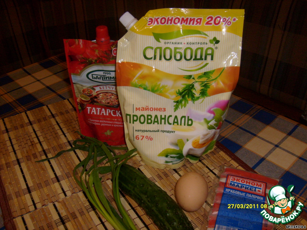 Начинить середину огурца смесью из майонеза, кетчупа, яйца. Положить наверх крабовые палочки.