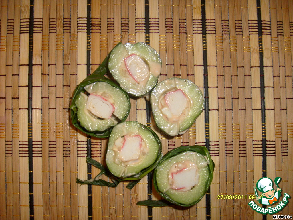 Соединить половинки огурца. В программе, повара, положили крабовые палочки сразу на обе половинки, но у меня и тут-то все стало "вылезать", так что справлялась с непривычки с трудом...