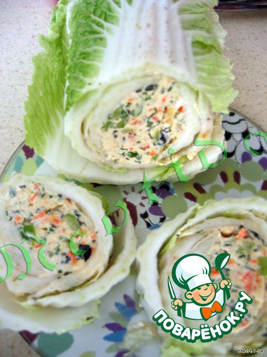 | Немного овощей, зелени в сочетании с творогом, сыром и майонезом, закрученное в качанчик китайской капусточки.. очень вкусная и красивая закусочка получается |