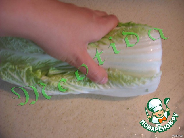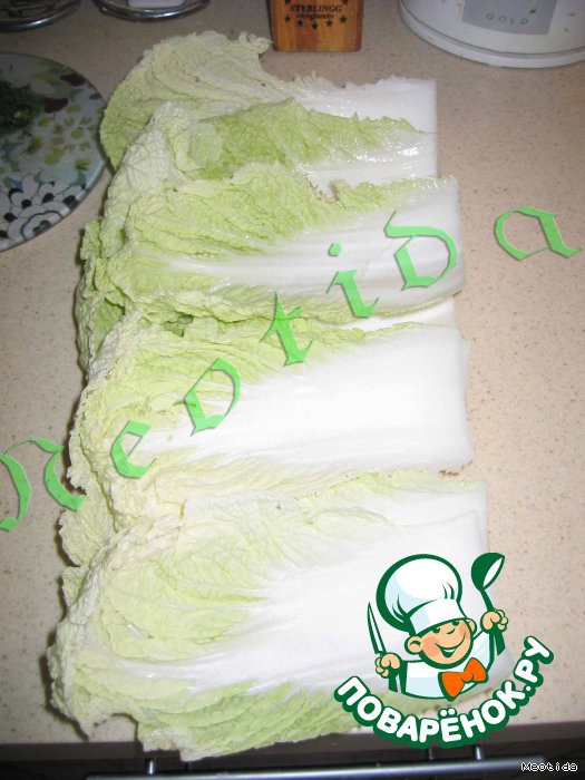 Помыть капусту, отрезать нижнюю часть. Положить качан на стол и аккуратно раскатать от себя (не перемешивая порядок листиков!). раскатать где-то половину качанчика (около 10 листиков), серединку убрать