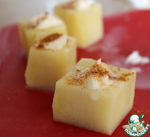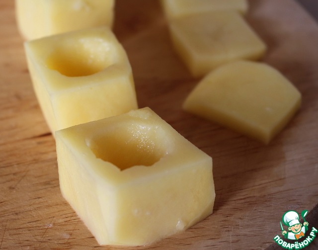 Картофель помыть, почистить. Из каждой картофелины вырезать кубик высотой приблизительно 4 см. Снять с кубика слой в 5 мм, это будет "крышкой", отложить в сторону. В оставшихся кубиках с помощью маленькой ложки сделать отверстие так, чтобы оставались стенки толщиной минимум 5 мм.