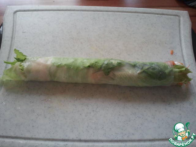 Пока выкладывали начинку, бумага размягчилась. Плотненько заворачивая начинку, свернуть рулетом. Очень важно плотно сворачивать, чтобы при нарезке начинка не вываливалась. Если порвалась рисовая бумага при закрутке, ничего страшного. Берем новый лист бумаги, окунаем в воду, растилаем на рабочей поверхности и заворачиваем в него наш бракованный рулет.