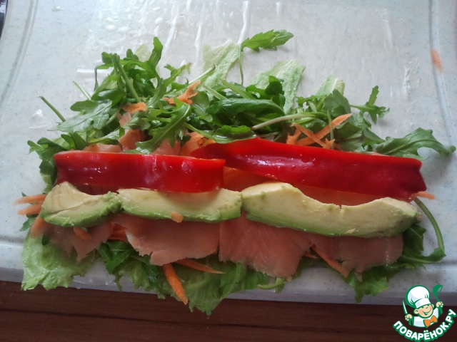 На мокрый лист рисовой бумаги выкладываем салат, морковь, сверху пару пластинок лосося, сверху авокадо по всей длине рулетика и паприку. Свернуть рулетом.