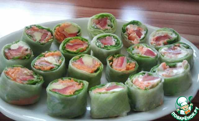| Вкусно, завернутый салатик с творогом или рыбкой не оставит никого равнодушным! Фигуре не навредит, сколько не скушаешь :) |