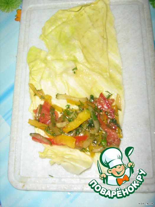 Пока занимались начинкой, рассол остыл - можно фаршировать капусту. В нежные листики заворачиваем начинку.