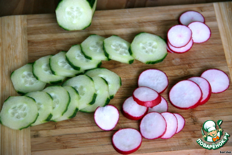 Нарезать огурец и редиску тонкими дольками.