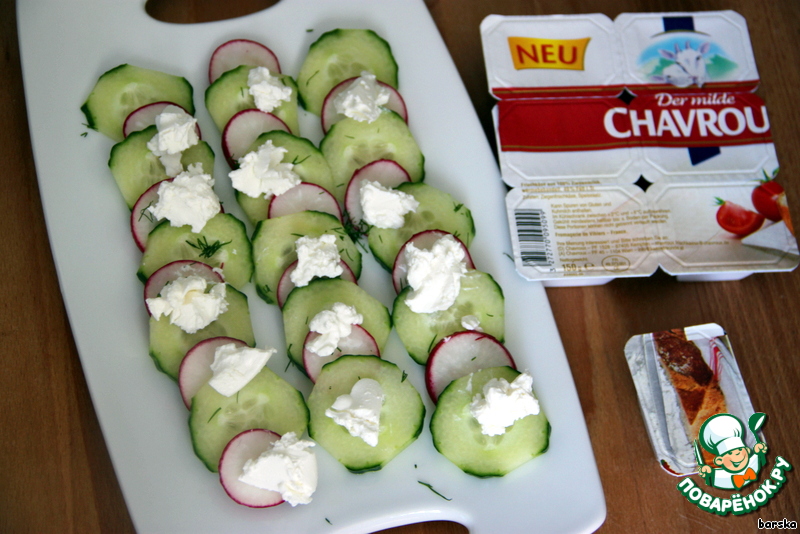 Разложить на овощи по кофейной ложечке мягкого козьего сыра.