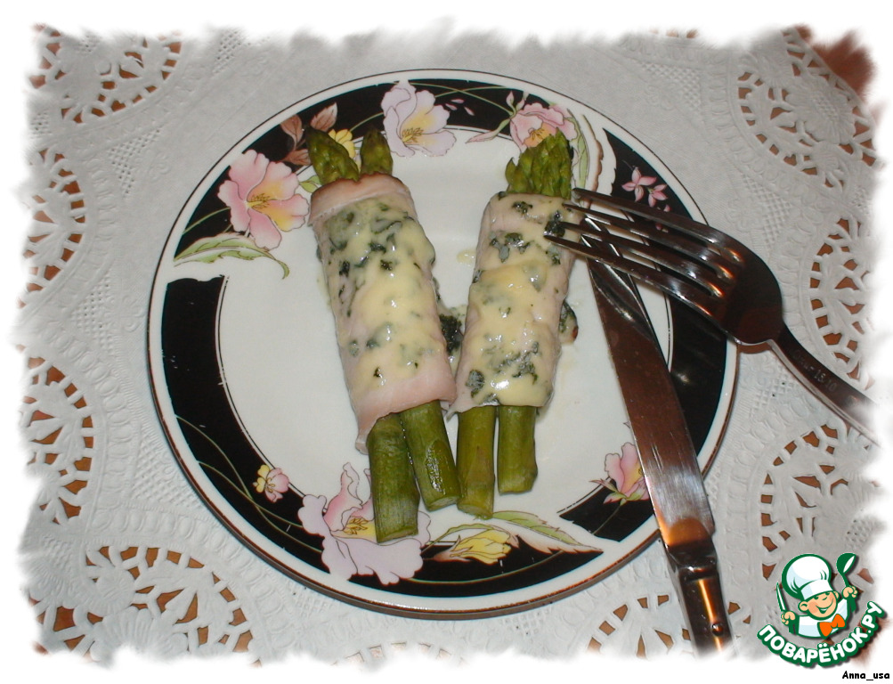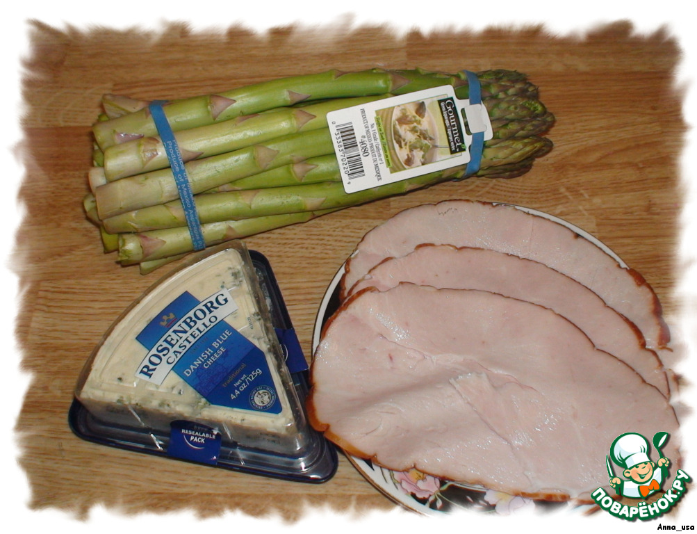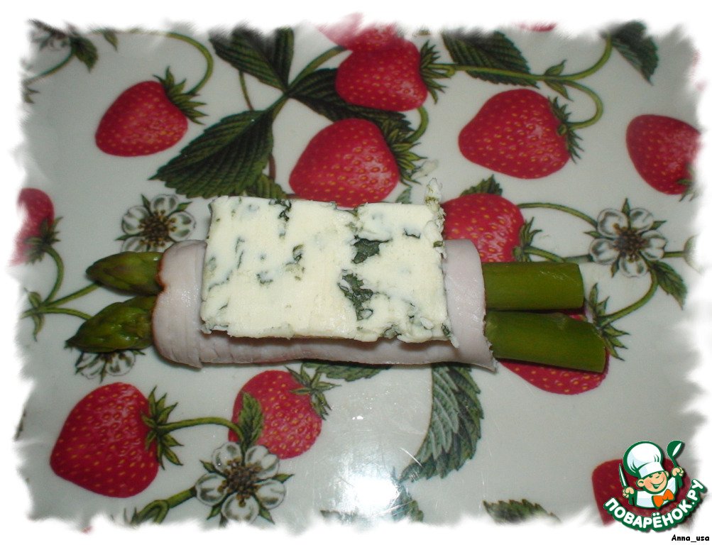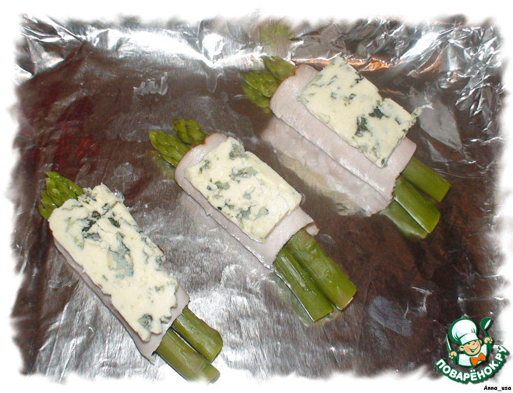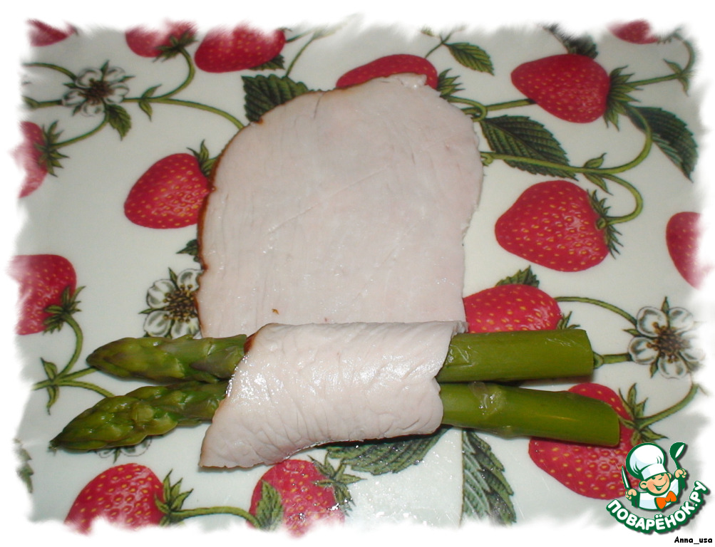 Заворачиваем спаржу в мясо (в данном случае слайсы копчёной индюшки). Если спаржа тонкая, то можно брать по 3 штучки, если не очень (как у меня), то по две.