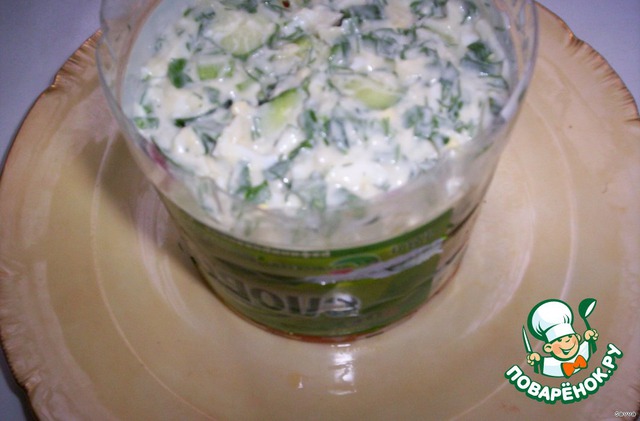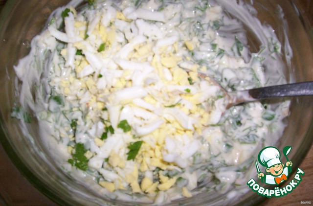 - Приготовим соус: майонез + плавленый сыр + измельченный чеснок + мелко порезанный лук + мелко порезанная зелень,