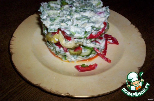 - на помидоры выложить соус + свежие огурцы +болгарский перец + малосольные огурцы +болгарский перец + соус +помидоры + свежие огурцы + добавить соус, чуть придавить ложкой