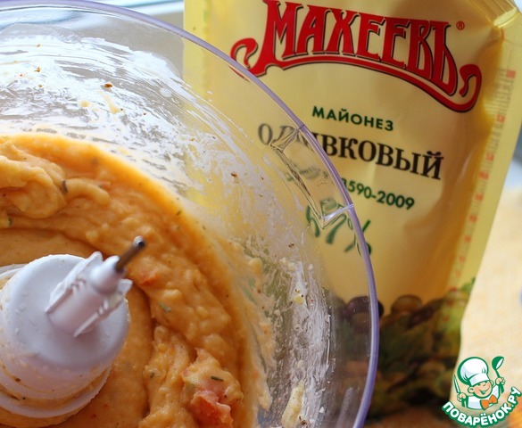 Пока террин готовится, мелко нарезать чеснок и смешать его с 2 ст. л. майонеза.