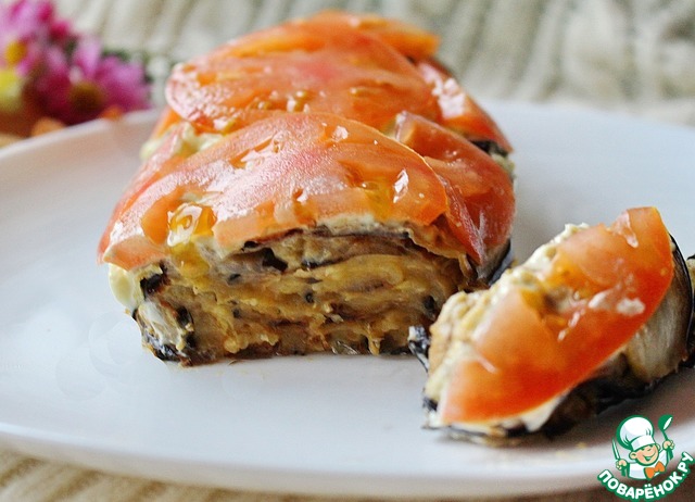 Прямоугольную форму застелить фольгой и смазать растительным маслом. Выкладывать попеременно баклажаны и помидорно-картофельную смесь. Причем первым и последним слоем должны быть баклажаны. После выкладывания помидорно-картофельной смеси, ее следует хорошо размазать. Выпекать в предварительно разогретой до 200 градусов духовке 15-20 минут.