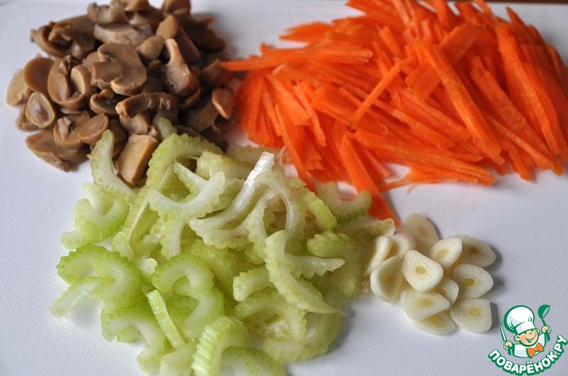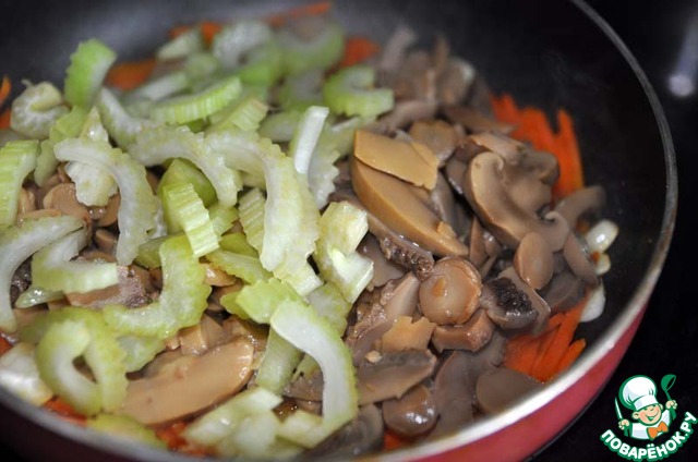 Кладём грибы и сельдерей и обжариваем ещё 2 минуты.