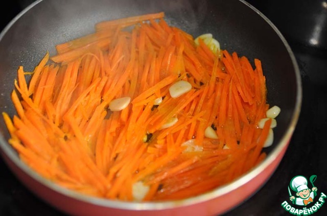 Добавляем морковь и при непрерывном помешивании обжариваем её 3 минуты.