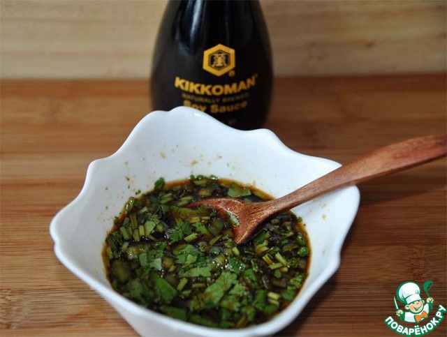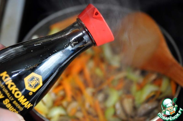Добавляем 2 ст. ложки соевого соуса Киккоман. Перемешиваем.