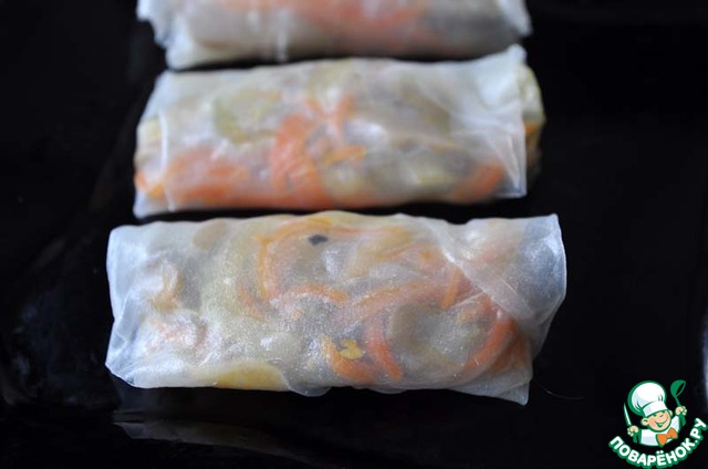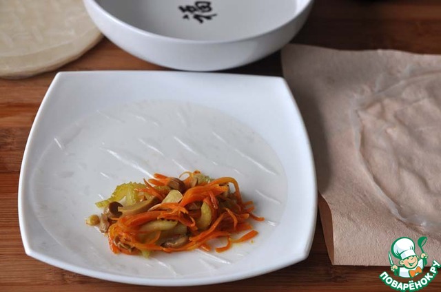 На край рисовой бумаги кладём 2 ложки овощной начинки.