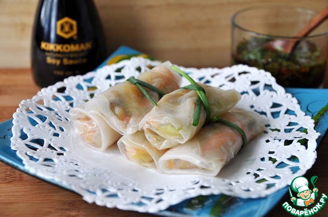 Для подачи каждый "конвертик" обматываем пером зелёного лука. Подаём с острым соусом. Такие "конвертики удобно" брать в качестве закуски на пикник.