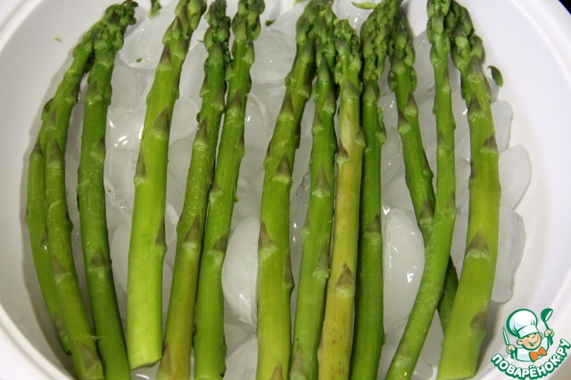 Затем слить воду и положить отваренную спаржу на лед, что бы она быстрее остыла и не размякла.