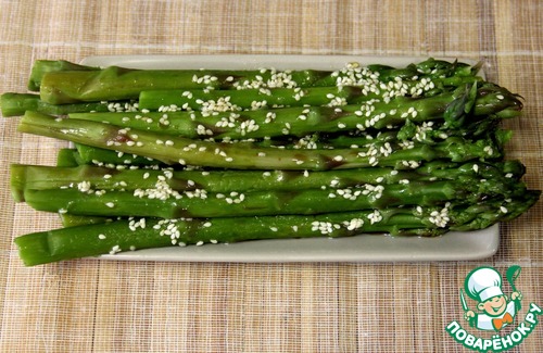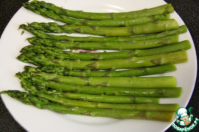 Когда спаржа остынет, промакнуть бумажным полотенцем и положить на тарелку.