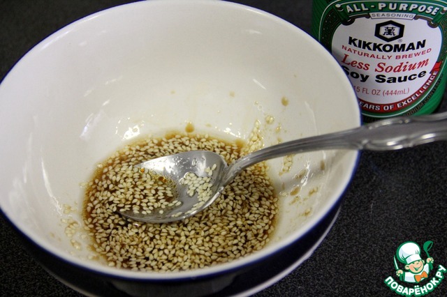 Для маринада смешать растительное масло, уксус, соевый соус, сахар и кунжутные семена и оставить настоятся примерно на 1 час.