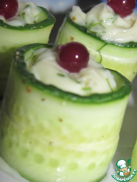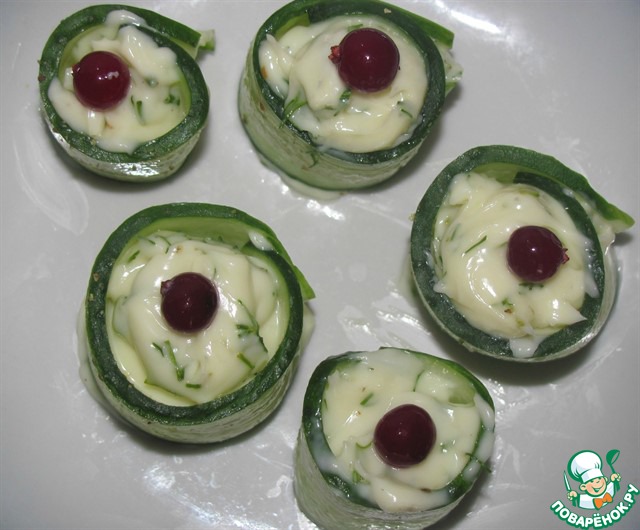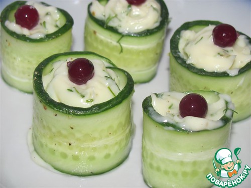 Чайной ложечкой выкладывем начинку на краешек огурчика и сворачиваем в трубочку. Сверху украшаем клюквинкой! Вот такие рулетики-закусочки у нас вышли! Хорошего отдыха в летнее время и хороших закусок!!!