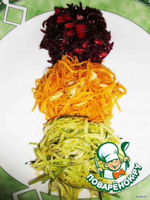 С кабачка и цуккини снять узкими продольными лентами кожицу, натереть на корейской тёрке. Морковь очистить и тоже натереть. Тоже проделать со свёклой. Чеснок очистить и измельчить.