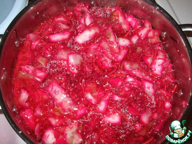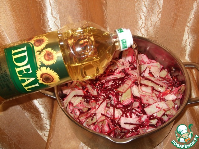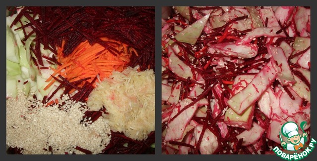 Смешиваем в кастрюле капусту+морковь+свек ла+чеснок+кунжут.