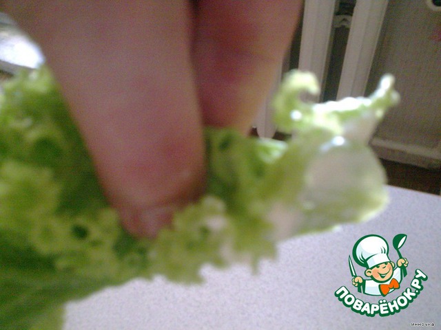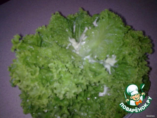 Листья салата тщательно промыть. Разложить на тарелку поштучно в один слой. Солим. Трём сверху примерно пол зубчика чеснока.