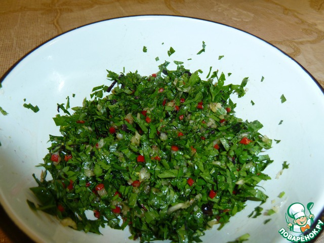Измельчить зелень, чеснок, перец (можно на мясорубке или блендере) и немного посолить.