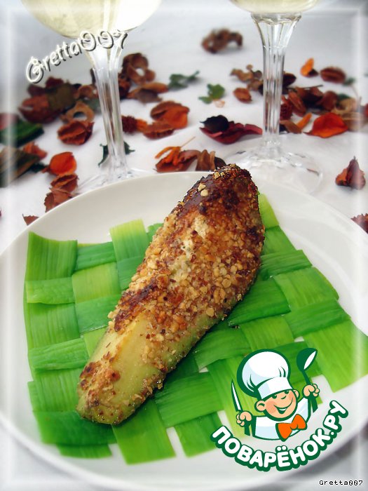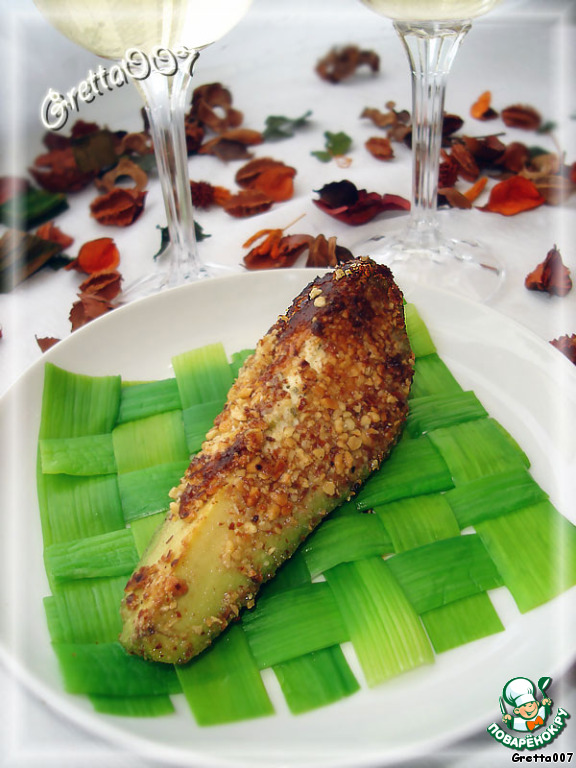 Подавать закуску можно на циновке из бланшированных листьев лука-порея или листьях салата.