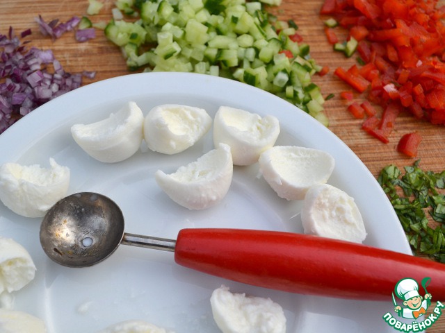 В моцарелле вырезать специальной ложкой или просто обычной чайной, но с заточенным краем, углубления. Дно у каждой моцарелки рекомендую слегка срезать ножом для будущей устойчивости.