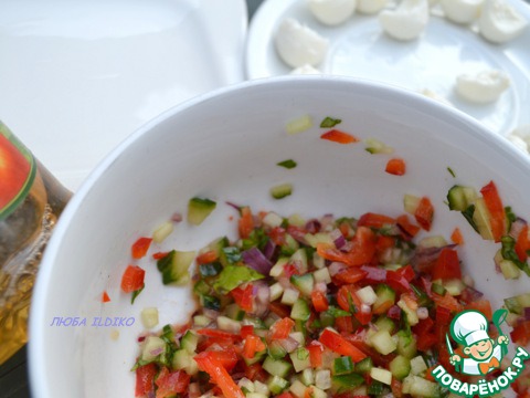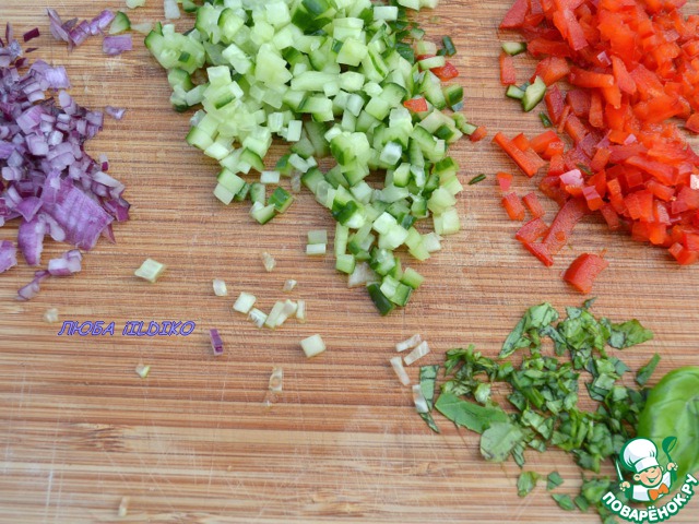 Красный лук тоже очистить, очень мелко порезать на кубики и желающие могут его замариновать в уксусе минут 5. Перец, огурец и базилик порезать тоже очень-очень мелко. Я пользуюсь тонким небольшим ножом с мелкой нарезкой по краю.