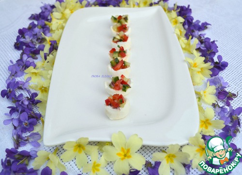 | У нас весна уже, наконец, самая-пресамая настоящая. Всё цветёт: сливы, вишни, цветы и в моём саду вот такие лесные цветочки сейчас уже отцветают. Пришлось мне для вас немного собрать их и украсить свою любимую моцареллу. Использовать для начинки моцареллы можно любой любимый ваш салат, но я люблю болгарский перец, огурец, базилик и красный лук. |