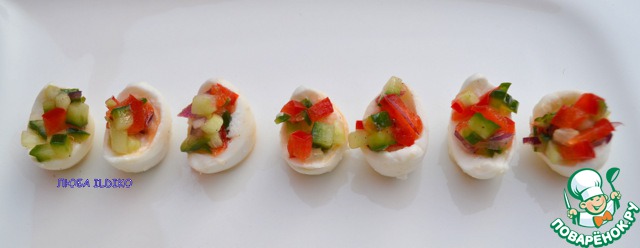 И начинить каждый шарик моцареллы. Выставить в ряд, или по кругу, или покрыть полностью всё дно блюда. Я обычно ещё сверху кладу накрест несколько тонких пёрышек зелёного лука. На столе смотрится прекрасно. Ну, а у нас весна, поэтому сегодня он в моей цветочно-цветовой гармонии не вписался.