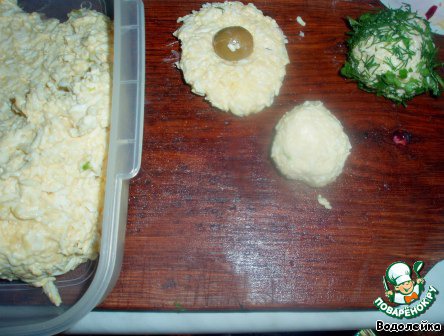 Хорошо все перемешиваем. Формируем небольшие шарики, внутрь каждого положить зеленую оливку и обвалять шарик в мелко нарубленной зелени.