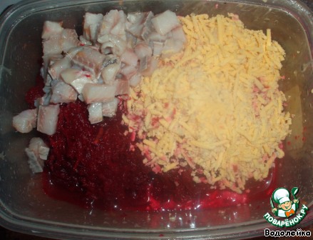 На мелкую терку трем свеклу (2шт средние), яичные желтки (4 шт), селедку режем мелко (примерно 100-150гр) + майонез.