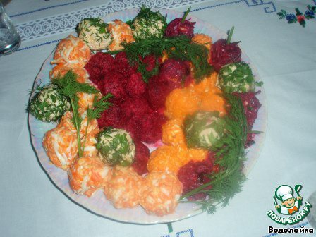Когда все наши закусочные шарики готовы, берем блюдо и выкладываем шарики на него так, как вам подсказывает фантазия. Украшаем зеленью, листьями салата. И ставим до подачи в холодильник.