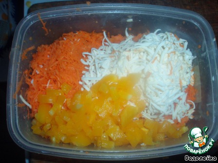 Трем на мелкую терку свежую морковь (2 шт средние), плавленый сырок (1шт) и режем мелко перец болгарский желтый (примерно полперца) + майонез и чеснок (по вкусу).