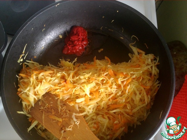Добавить масло, томатную пасту, прожарить ее, помешивая.